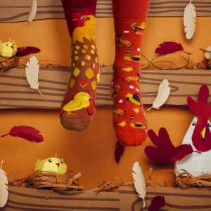 • Mismatched: Obwohl jedes Paar ein gemeinsames Thema oder eine Farbpalette teilt, haben die beiden Socken oft unterschiedliche Muster oder Illustrationen.
