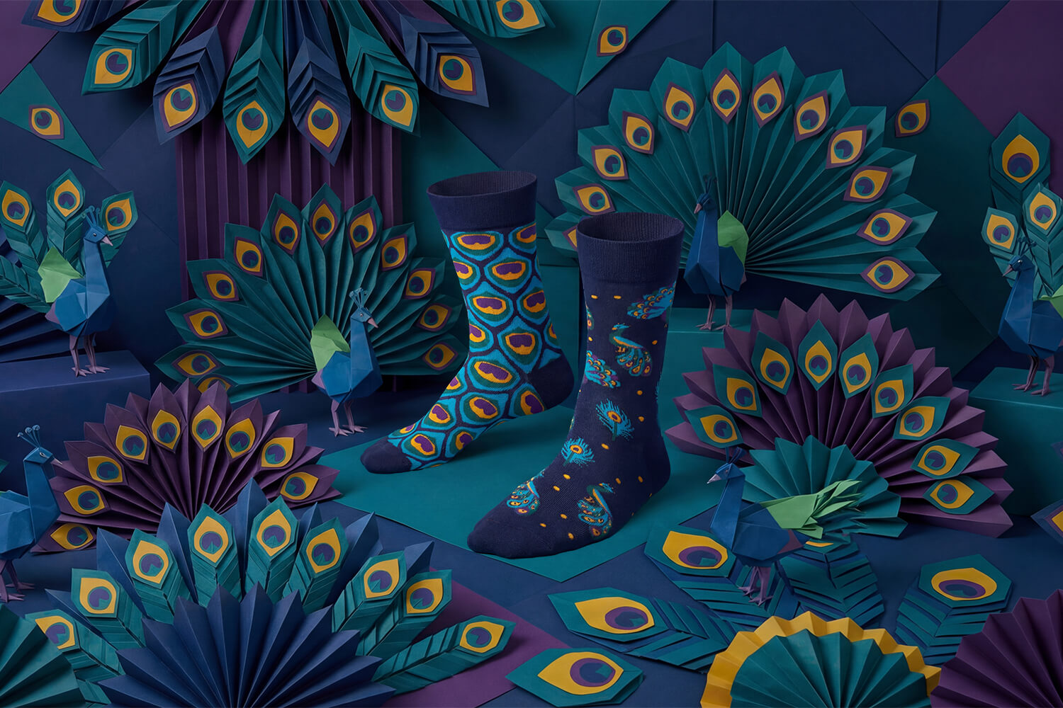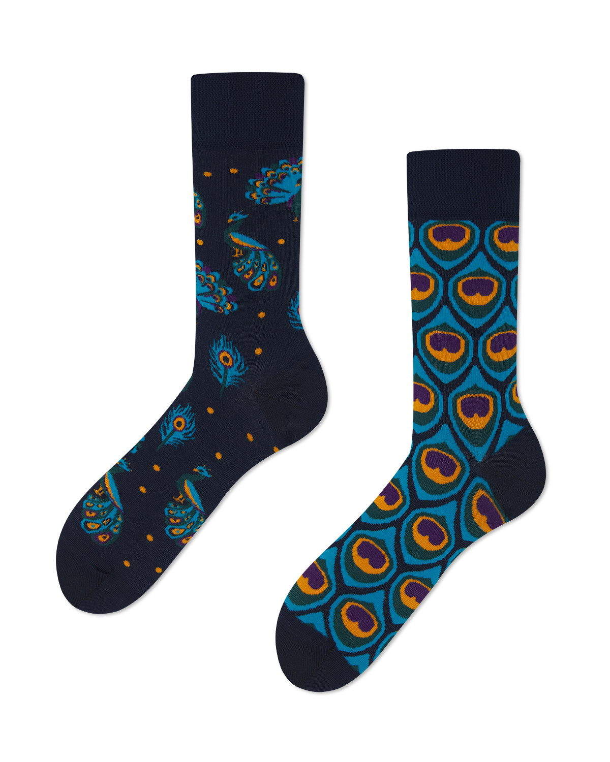 Elegante und verspielte Mismatched Socken mit Pfau-Motiv – hochwertige Tiersocken in edlen, dunklen Tönen, ein majestätischer Hingucker für jeden Anlass.